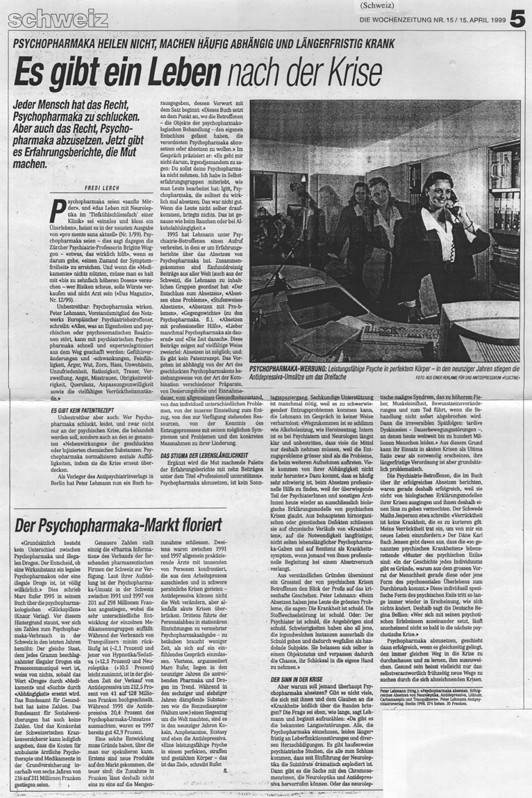 Washington) Keine Patentrezepte. Rezension in: Soziale Psychiatrie, 23. Jg. (1999), Nr. 3, S. 58/59 / PDF Seit 1986, als er seinen »Chemischen Knebel« veröffentlichte, macht Peter Lehmann ÄrztInnen die Kompetenz auf deren ureigenstem Gebiet streitig: dem Wissen über die gesundheitlichen Auswirkungen der Psychopharmakabehandlung. Aus der Überarbeitung des längst zum Klassiker gewordenen Buches erschien nun nach »Statt Psychiatrie« (1993) und »Schöne neue Psychiatrie« (1996, zwei Bände) mit »Psychopharmaka absetzen« das abschließende vierte Buch. Doch wer meint, Lehmann würde zum plumpen Wegwerfen von psychiatrischen Psychopharmaka aufrufen, sieht sich getäuscht. Patentrezepte, mit denen Probleme beim Absetzen und beim Entzug ausgeschlossen werden können, weist Lehmann mitsamt seinen 34 psychiatriebetroffenen AutorInnen aus Belgien, Dänemark, Deutschland, England, Jugoslawien, Neuseeland, Österreich, Schweden, Ungarn, der Schweiz, den Niederlanden und den USA ausdrücklich zurück. Diese, ursprünglich mit den üblichen psychiatrischen Diagnosen (»affektive Psychose«, »Schizophrenie«, »endogene Depression«, »Zwangserkrankung« usw.) etikettiert, schildern in übersichtlich gegliederten Kapiteln, wie sie teils problemlos und teils mit Schwierigkeiten ihre Psychopharmaka nach mitunter jahrzehntelanger Einnahme absetzten. Ergänzend berichten eine Psychiaterin und Ärzte, PsychotherapeutInnen, SozialarbeiterInnen und HeilpraktikerInnen, wie sie ihren KlientInnen beim Absetzen helfen. Dass die AutorInnen (darunter DGSP-bekannte Gesichter wie Wolfgang Voelzke und Regina Bellion) nur positive Verläufe schildern, liegt an der Tatsache, dass der Herausgeber Lehmann lediglich an erfolgreichen Absetzversuchen interessiert war. Darf man ein Thema so einseitig betrachten? Ein berechtigter Vorwurf, allerdings gewinnt diese Herangehensweise an Legitimität angesichts der Menge an psychiatrischer Literatur, deren AutorInnen sich ausschließlich auf Misserfolge beim Absetzen konzentrieren und dabei noch nicht einmal zwischen echtem Rückfall und möglichen Entzugsproblemen differenzieren. Lehmann möchte Beispiele bringen, wie andere es schaffen, nach dem Absetzen nicht gleich wieder im nächsten ärztlich-psychiatrischen Behandlungszimmer zu sitzen, und dies ist ihm in anschaulicher Weise gelungen. Manche ließen ihre Psychopharmaka einfach weg, andere suchten (und fanden) Unterstützung bei TherapeutInnen oder Selbsthilfegruppen. Wer mit einem Rückfall rechnete, setzte diesem Risiko eigene Aktionen entgegen, z.B. autogenes Training, soziales Miteinander und Engagement, Auseinandersetzung mit dem Sinn der Verrücktheit, Vermeiden von stressigen (Familien-)Beziehungen, Aufspüren des eigenen Verantwortungsanteils an der Psychiatrisierung, Aufenthalte in der Natur, Joggen, Yoga, Meditation, spirituelle Wege und Gebete. Die AutorInnen liefern eine beeindruckende Vielfalt von Gegengewichten, mit denen sie den Grundstein für ein erfüllteres Leben legen und somit den Wegfall der mitunter vorübergehend hilfreichen Psychopharmakawirkung ausgleichen können. Als weitere Hilfen beim Verringern von Absetz- und Entzugsproblemen gelten homöopathische Entgiftung, Linderung von Entzugsproblemen mit naturheilkundlichen Mitteln (z.B. Johanniskraut, Baldrian), Körperarbeit, Psychotherapie und vieles mehr. Bei sich abzeichnenden Problemen sei die allmähliche Dosisreduzierung der beste Weg, Entzugsrisiken zu verringern. Dies sei besonders wichtig, wenn das Psychopharmakon länger als ein oder zwei Monate verabreicht wurde. Optimal wäre es, wenn alle Faktoren, die von den AutorInnen (darunter eine Reihe Mitglieder des Bundesverbands Psychiatrie-Erfahrener) als Voraussetzungen für ein erfolgreiches Absetzen genannt wurden, gleichzeitig vorhanden sind: eine verantwortungsbewusste Einstellung, eine an die Bedingungen des Körpers, des Psychopharmakons, der Dosis und Dauer der Einnahme angepasste Absetzgeschwindigkeit, ein unterstützendes Umfeld, geeignete Hilfemaßnahmen, fähige Profis und eine unterstützende Selbsthilfegruppe. Da in der Regel jedoch die Bedingungen beim Absetzen alles andere als optimal sind und Psychopharmakaverabreicher, die um Hilfe ersucht werden, diese aus welchen Gründen auch immer verweigern, bleibt schlimmstenfalls nichts anderes übrig, als sich wie Münchhausen am eigenen Schopf aus dem psychopharmakologischen Sumpf herauszuziehen. Bei den Betroffenen möglicherweise vorhandene Ängste sollten durch sachliche und fundierte Informationen über Risiken der Psychopharmaka sowie des Absetzens relativiert und so verringert werden. Egal wie man als psychosozial Tätige die Risiken des Absetzens einschätzt, ob die Gründe für das Absetzen als rational oder irrational bewertet werden: Die Entscheidung liegt letztlich bei den Betroffenen, und diese verhalten sich nicht anders als der Rest der Gesellschaft zu 50 Prozent lassen sie die ärztlich verordneten Pharmaka weg. Gut, dass es jetzt das neue, zudem auch noch spannend zu lesende Buch zu dem bisher sträflich vernachlässigten Thema gibt. Keine Smarties. Rezension in: Brückenschlag Zeitschrift für Sozialpsychiatrie, Literatur, Kunst: Band 15/1999 (»Orte der Heimat Wo ist meine Seele zu Hause?«), S. 236-238 / PDF Man kann sie mögen oder nicht, diese als Sammelbände bezeichneten Bücher, in denen zwanzig und noch mehr Autoren ihre Erfahrungen schildern, der Autor X auf Seite 23 dabei der Autorin Y auf der Seite 178 widerspricht, ohne dass für die Lesenden dieser Widerspruch irgendwie aufgelöst würde, und man dabei etwas ratlos zurück bleibt... aber es gibt Themen, denen kann man sich zunächst gar nicht anders nähern. Peter Lehmann hat ein solches Buch herausgegeben bzw. besser: initiiert. Anfang 1998 verbreitete er einen Aufruf, in dem er um Erfahrungsberichte über das Absetzen von Psychopharmaka bat. Eine Auswahl dieser Texte ist nun erschienen. Lehmann hat diese satten 375 Seiten in folgende Kapitel 